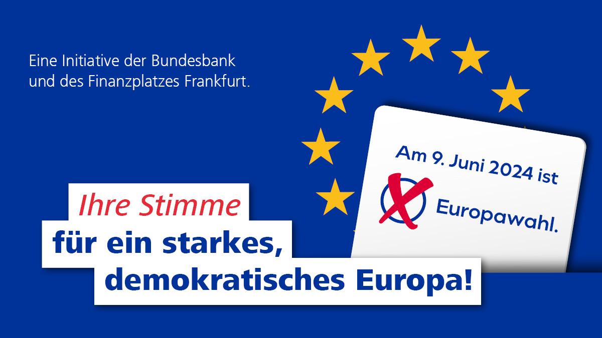 Die Deutsche Bundesbank und Frankfurt Main Finance wenden sich anlässlich des Europa-Tags am 9. Mai gemeinsam mit zahlreichen Repräsentantinnen und Repräsentanten des Finanzplatzes und der Region an die Öffentlichkeit. Beide Institutionen und die Unterstützenden des gemeinsamen Appells rufen dazu auf, sich an der Europa-Wahl am 9. Juni zu beteiligen, um Europa und seiner Demokratie eine starke Stimme zu geben.